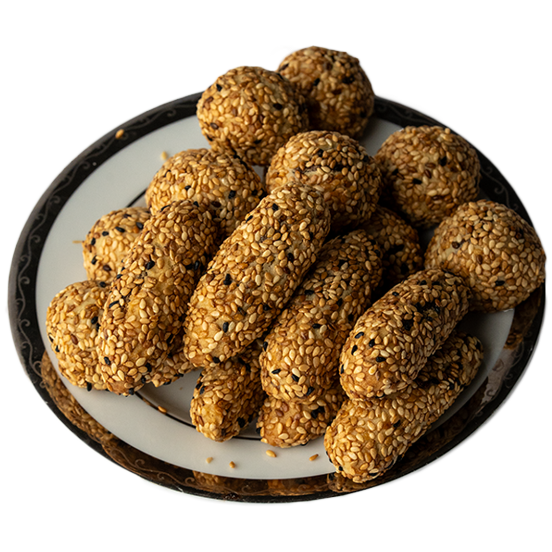 Traditional Middle Eastern cookies made with a crisp, buttery base coated in sesame seeds and topped with crushed pistachios. Lightly sweet and wonderfully crunchy, they offer a perfect blend of nutty flavor and delicate texture.